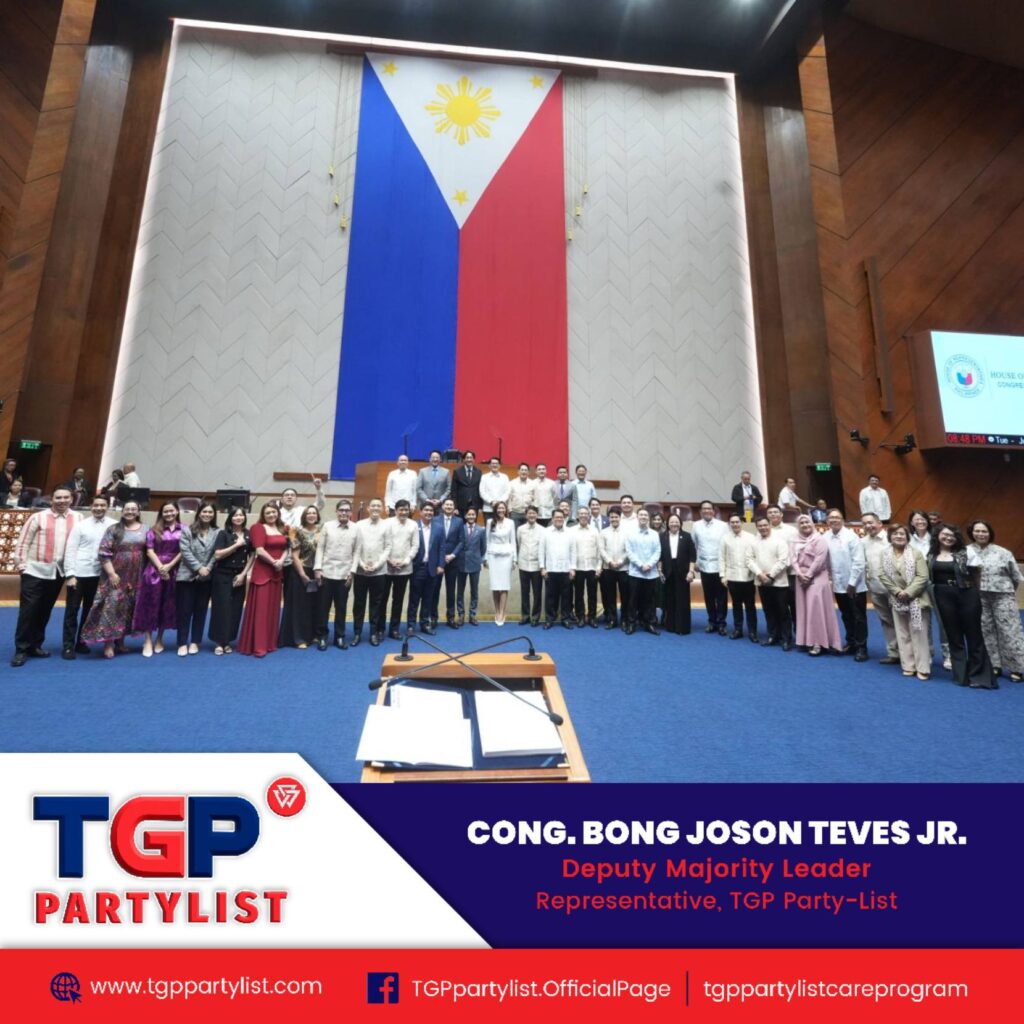 Deputy Majority Leader and TGP Partylist Representative Bong Joson Teves Jr. stood with fellow lawmakers at the Congress plenary hall during the 1st Regular Session of the 20th Congress — pushing for laws that truly care for the Filipino people.