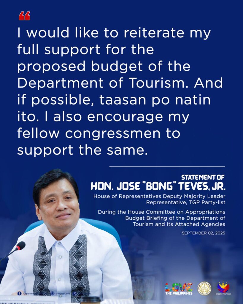 TGP-Partylist Representative Jose “Bong” Teves, Jr. manifested his support for the Department of Tourism (DOT)
