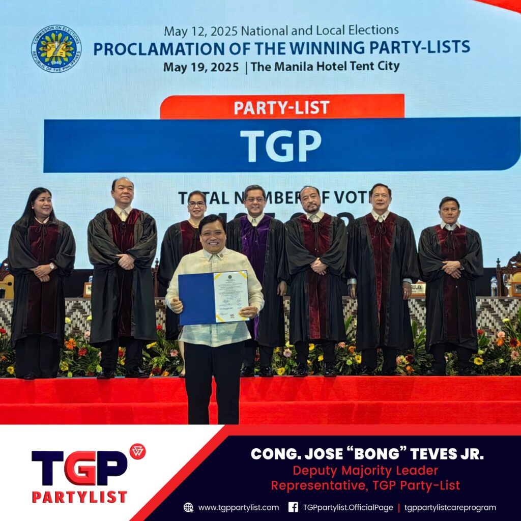 Opisyal ng naiproklama ng COMELEC ang TGP Party-List para sa ikatlong termino sa Kongreso! Sa pangunguna ni Deputy Majority Leader Congressman Bong Teves, Jr. dumalo ang ating nominees, leaders, board of trustees at team sa proclamation event sa Manila Hotel Tent City.